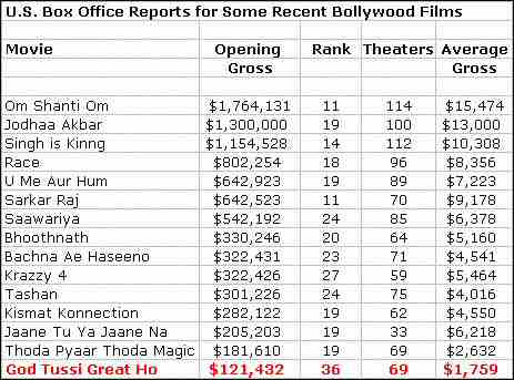 Distributed by Eros International in the U.S., God Tussi Great Ho came in at No-36 in the August 15-17 weekend compared to No-23 for Bachna Ae Haseeno.