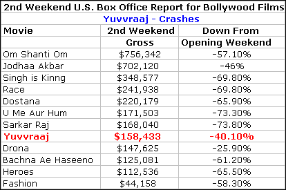 Since Yuvvraaj had a lousy first weekend too at the U.S. box office, a 40% crash in the second weekend does not augur well.