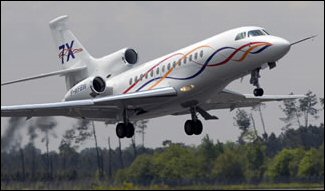 The French-made luxury jet seats up to 12 in a plush interior with leather seats, sofas and a customizable entertainment center, according to Dassault’s sales literature. It can cruise 5,950 miles before refueling and has a top speed of 559 mph.