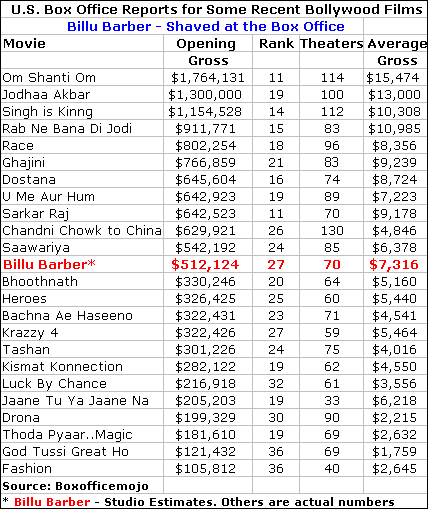Studio estimates provided by boxofficemojo show that Billu Barber grosssed a mere $512,124 in its opening three-day weekend at the U.S. box office.